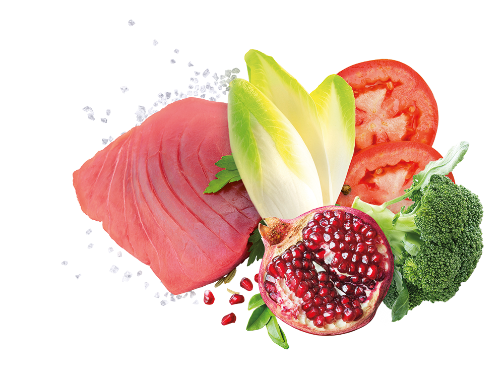 Ингредиенты: тунец (90%), рис, горох, рыжиковое масло, оливковое масло (0,1%), сушеная мякоть цикория (0,1%), конопля, гранат дегидратированный (0,01%), томат дегидратированный (0,01%). ), обезвоженная брокколи (0,01%), β-1,3 глюканы из водорослей Euglena gracilis, глюкозамин, юкка мохаве, хондроитинсульфат.