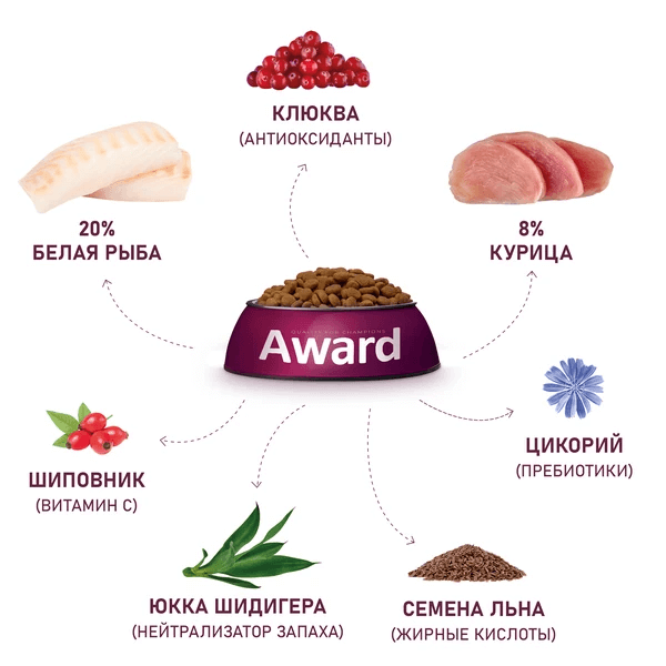 Сухой корм AWARD Sterilized для взрослых стерилизованных кошек с белой рыбой с добавлением семян льна, клюквы и цикория.