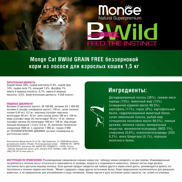 Monge (Монж) Cat BWild GRAIN FREE (холистик) полнорационный беззерновой корм из лосося и гороха для взрослых кошек и котов.