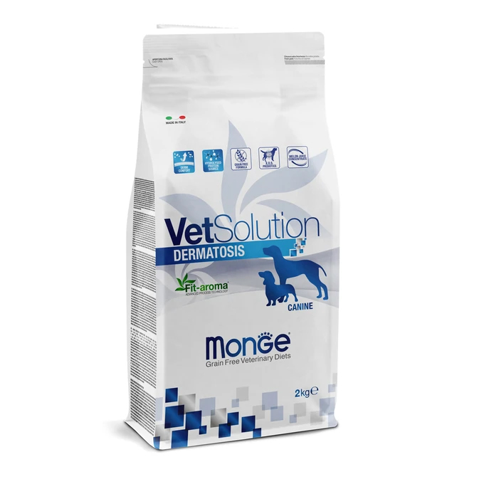 Лечебный корм Monge (Монж) VetSolution Dog Dermatosis Дерматозис для собак при заболеваниях кожи, таких как дерматит, хронический зуд, заболеваниях кожи, сопровождающиеся воспалением, пищевая аллергия и пищевая непереносимость.